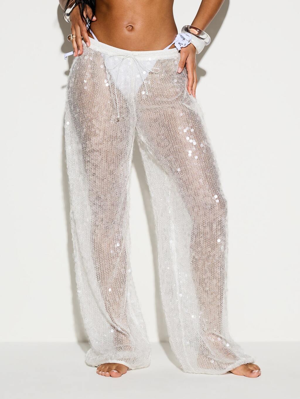 KIZN Calças de malha com pernas largas e lantejoulas brancas